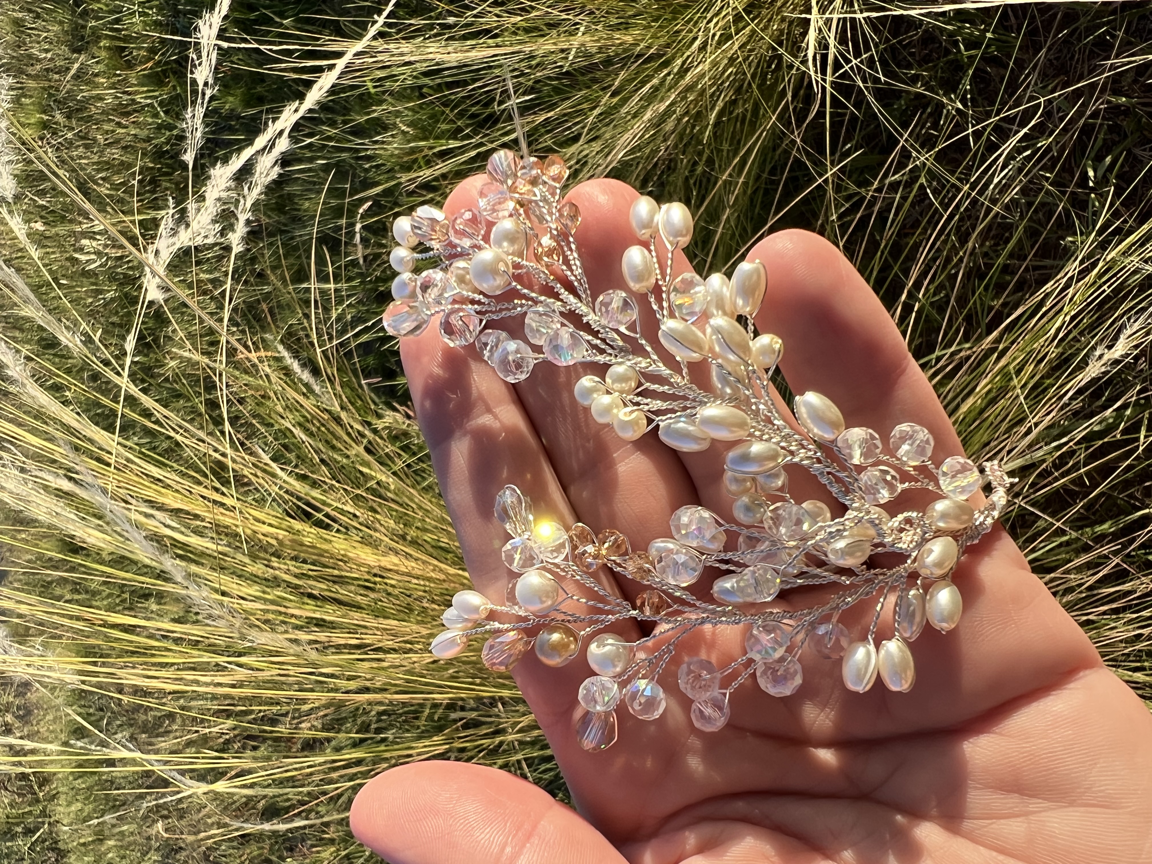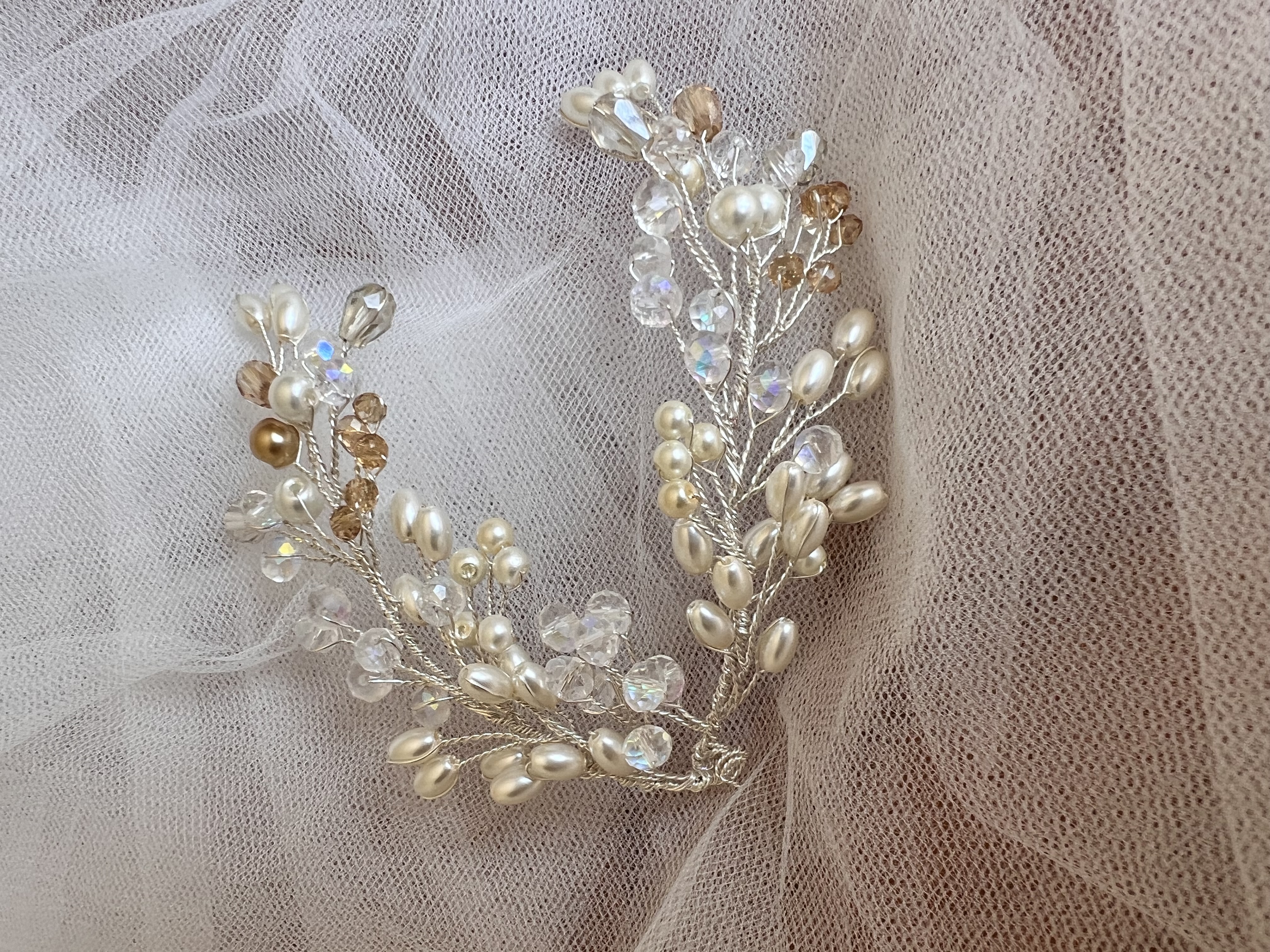 Tocado lateral de perlas de río y cristal, tono cálido o frío a elección